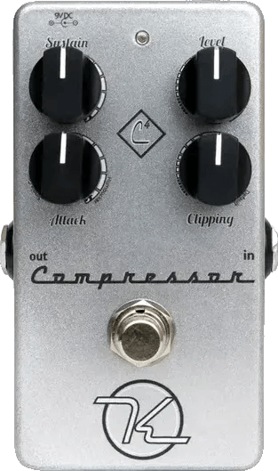 - 4-knob compressor pedal with controls for sensitivity, attack, clipping, and sustain