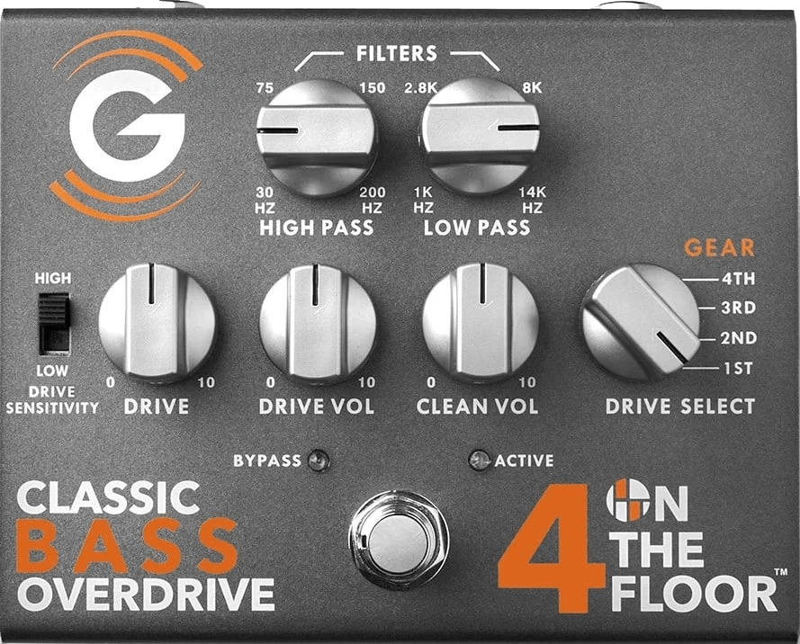 The Genzler Amplification 4 On The Floor is an all-analog bass overdrive pedal designed to offer four selectable overdrive modes, each based on classic tube amp circuit topologies. This bass effects pedal provides discrete control over drive/gain and features separate high-pass and low-pass filters for shaping the overdrive path. A dedicated clean blend knob allows users to balance clean and driven signals. The 4 On The Floor pedal supports a range of playing styles and tonal requirements, enabling detailed adjustment of harmonic content and compression while maintaining low noise and touch response. Four "gear" settings range from subtle breakup to aggressive overdrive, giving access to multiple classic overdrive textures.