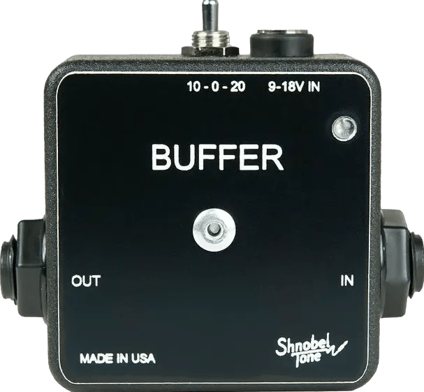 The Shnobel Tone Buffer is a compact class A buffer pedal designed to convert a high impedance instrument signal to a low impedance output, preserving signal strength and clarity over long cable runs. This model includes a top-mounted toggle switch that engages a cable emulation circuit, allowing users to simulate 10 or 20 feet of cable length at the input, replicating the capacitance effect often required when interfacing with vintage-style effects circuits. Setting the toggle to zero deactivates this emulation for standard buffer operation.