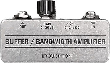 The Broughton Audio Buffer Bandwidth Amplifier is a utility buffer pedal designed to maintain signal clarity and reduce noise in any signal chain. This always-on effects pedal preserves the natural tone of your instrument by providing a consistent impedance, preventing high-frequency loss and filtering out subsonic and ultrasonic noise. The pedal supports a range of setups and ensures reliable signal transfer to pedals, preamps, DI boxes, amplifiers, mixers, and recording interfaces.