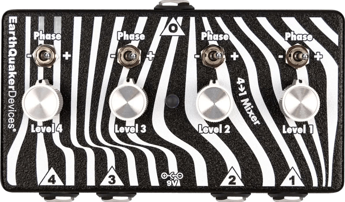 The EarthQuaker Devices 4 To 1 Mixer is a utility audio mixer designed to combine up to four separate audio signals into a single output. Each input is equipped with a unity gain buffer, maintaining signal integrity by providing a flat frequency response, a high 1MOhm input impedance, and a low 100 Ohm output impedance. This buffered mixer is built to prevent signal loss over long cable runs and to preserve clarity across various setups. The unit can be used for splitting and mixing signals in parallel processing chains or for routing multiple audio sources into one path.
