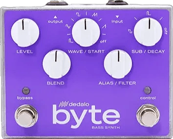 The Dedalo Fx Byte BYT-1 is an 8-bit digital synthesizer effects pedal designed for signal processing and sound creation. This device features a main oscillator with five selectable waveforms and a sub-octave generator with two waveform options. An integrated low-pass filter is included, equipped with an envelope control for additional tonal shaping. The pedal’s circuitry introduces intentional aliasing, adding classic digital character to the signal.