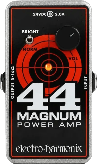 The Electro-Harmonix 44 Magnum is a compact power amplifier pedal designed to deliver 44 watts of output into 8 or 16 ohm speaker cabinets. This amp pedal provides a clean, neutral response at lower settings and is capable of achieving natural power amp overdrive when pushed. It features a brightness switch for toggling between a flat frequency response and a boosted high-end for increased clarity. Suitable for use with a variety of electric instruments, the 44 Magnum offers maximum headroom potential and can drive speaker cabinets from a pedalboard setup. A dedicated power adapter is included for reliable operation.