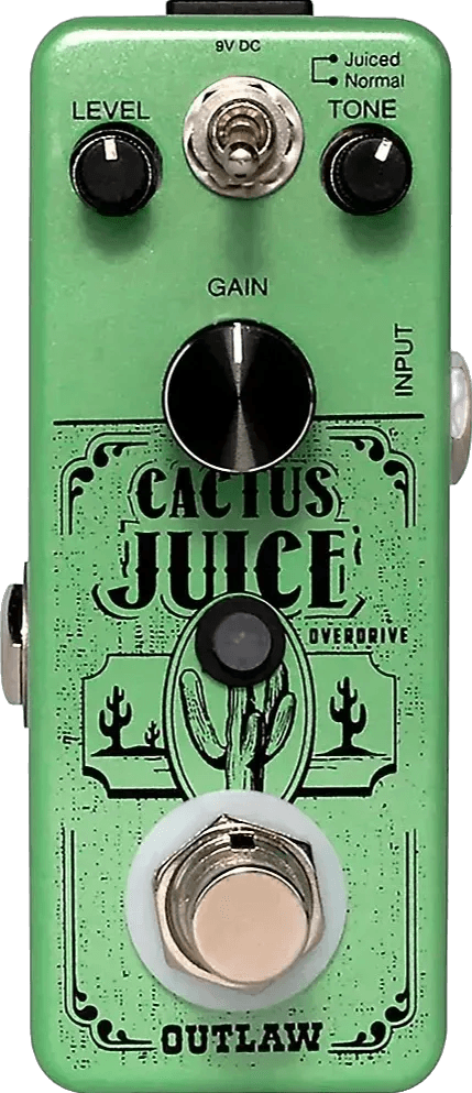 The Outlaw Effects Cactus Juice Overdrive is an overdrive effects pedal designed to deliver warm, amp-like drive tones. Inspired by classic screamer circuits, it features a JUICED/NORMAL toggle switch for two distinct gain settings. The NORMAL mode produces a traditional, creamy overdrive, while the JUICED mode adds increased gain for a more saturated effect. Core controls include dedicated knobs for adjusting level, tone, and drive, allowing users to fine-tune their sound. Compact and pedalboard-friendly, this stompbox is equipped with true bypass switching for signal integrity when bypassed.