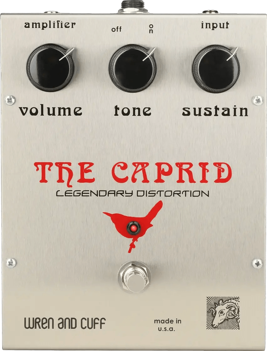 The Wren and Cuff Caprid OG is a vintage-inspired fuzz effects pedal, designed as a detailed reproduction of the mid-1970s violet-era Ram's Head Muff circuit. This fuzz stompbox features three hand-selected orange-dot transistors and one violet-dot transistor, paired with 1/2 watt carbon composition resistors, and high-quality capacitors. The unit is constructed in a full-size enclosure and delivers a saturated, balanced fuzz sound with prominent sustain, controlled lows, and a distinctive midrange scoop. This Caprid OG is available in a limited Black-Violet Custom Color finish, matching the sonic and build specifications of the Blue-Violet edition, differing only in its visual design.