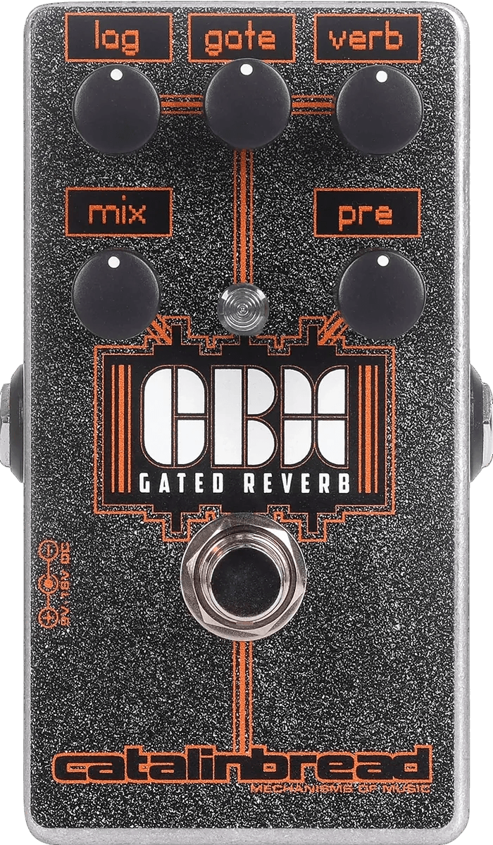 The Catalinbread CBX Gated Reverb is a gated reverb effects pedal that recreates a well-known studio reverb effect from the 1980s. This pedal uses a reverb circuit combined with noise gate technology to shape the reverb trail, enabling abrupt or tightly controlled decays characteristic of the gated reverb sound. The CBX Gated Reverb offers user control over parameters such as reverb level, gate threshold, and decay time. It features true bypass switching to preserve signal clarity when the effect is disengaged.