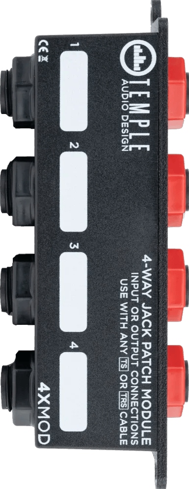 The Temple Audio 4X MOD is a modular patch bay designed for Templeboard pedalboards. It enables routing of up to four 1/4" signals through the side panel, allowing flexible integration of audio and control connections within a pedalboard setup. Each jack on the 4X MOD can function as an input or output, supporting a variety of signal types, including mono, stereo, TRS, balanced, unbalanced, and expression pedal signals.