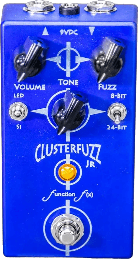 The Function F(X) Clusterfuzz Jr. is a compact fuzz effects pedal designed to deliver the same distortion circuit and sonic characteristics as the full-sized Clusterfuzz, in a standard 125B enclosure. This fuzz stompbox utilizes the same component values and types as its larger counterpart, offering a streamlined layout while maintaining core tonal features.