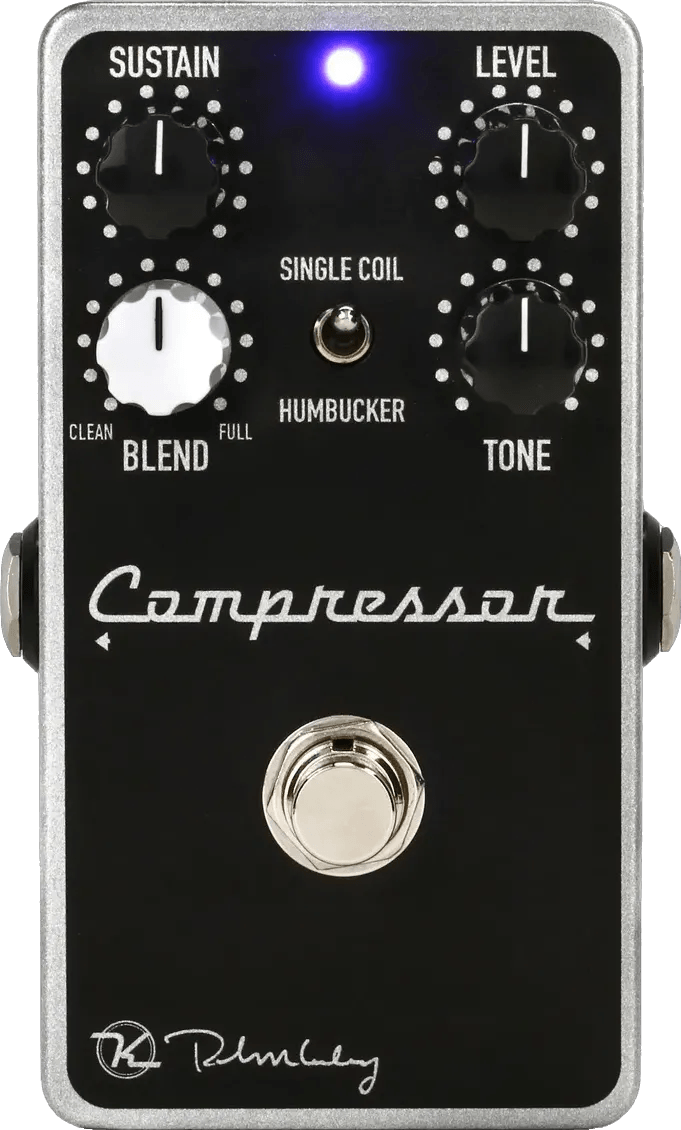 - Compressor effects pedal with Level, Sustain, Tone, and Blend controls