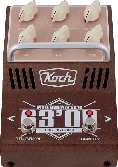 The Koch 63 OD is a tube-driven overdrive preamp pedal designed to deliver vintage-inspired tones with modern switching and connectivity. This dual-channel preamp features Clean and Overdrive sections that share a three-band EQ, as well as an OD Boost switch for additional gain. The unit provides pre and post effects loops for flexible pedal integration, a balanced XLR DI output with speaker emulation and ground lift, and a 1/4" output with selectable levels for compatibility with various amplifiers and monitor systems. Additional options include a 9VDC power output for effects pedals (up to 200mA) and a remote input for external switching or MIDI control. Both the XLR and 1/4" outputs can be used simultaneously.