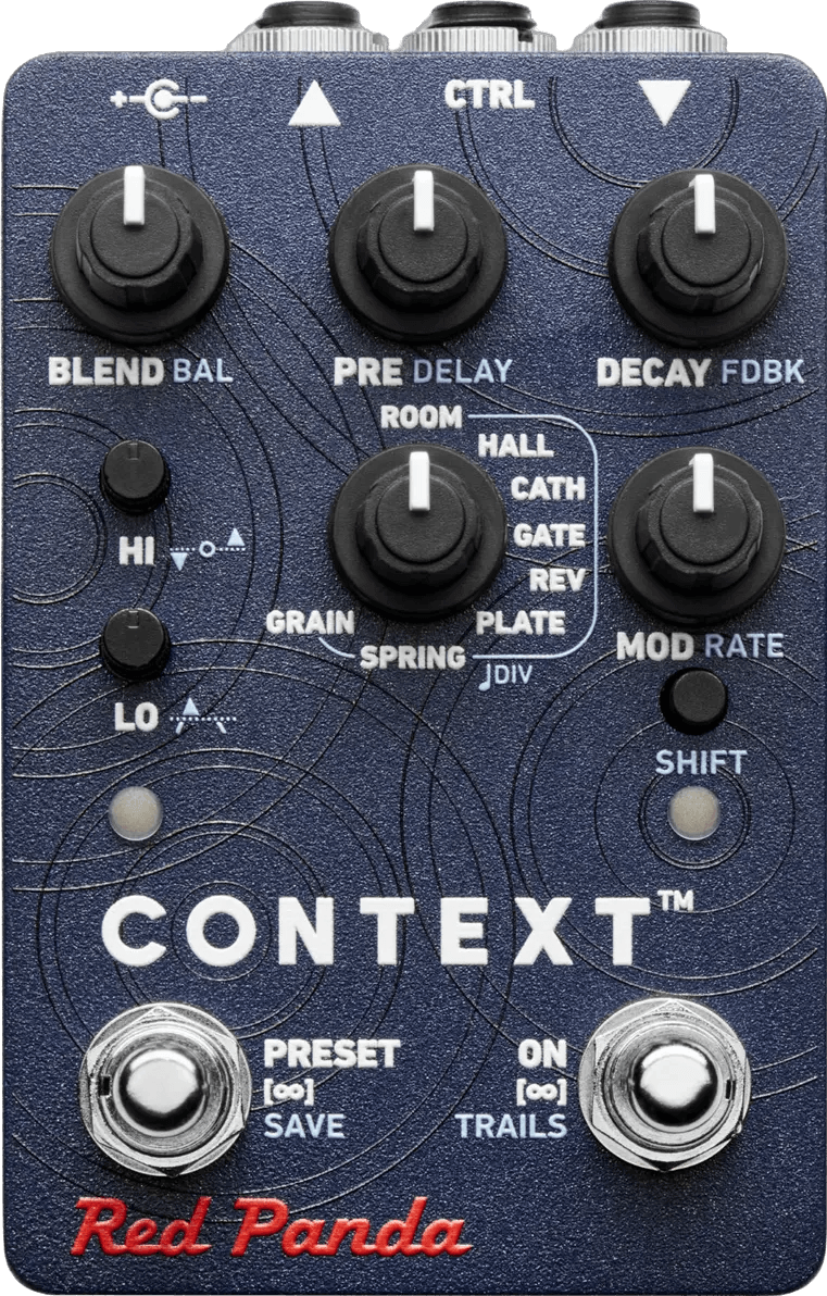The Red Panda Context 2 is a stereo reverb effects pedal featuring 8 reverb algorithms, including room, hall, cathedral, gated reverb, reverse reverb, plate, spring, and granular reverb. This reverb pedal offers stereo input and output, delay with reverb in all modes, and USB MIDI control. The unit features high and low frequency damping controls, allowing for dynamics processing such as ducking reverb and expandable reverb with adjustable threshold and recovery time. Modulation, dynamic reverb, and infinite sustain are accessible via footswitches. The Context 2 reverb pedal supports up to 127 presets with MIDI or a compatible footswitch, and provides a fully assignable expression pedal or CV input for parameter control. When the shift button is held, the top controls manage delay parameters.