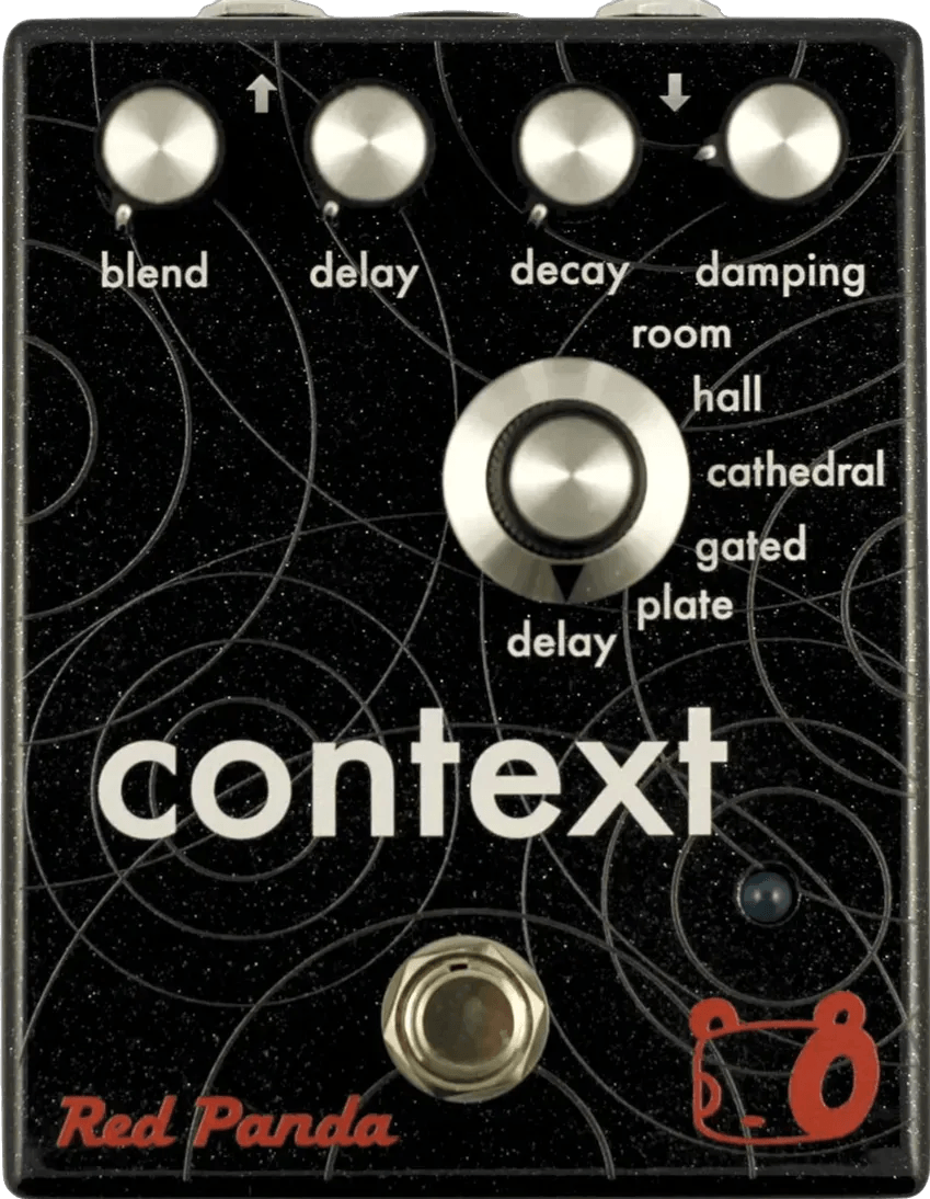 The Red Panda Context V1 is a digital reverb effects pedal offering six selectable reverb algorithms for a range of ambient and spatial effects. Available reverb modes include Room, Hall, Cathedral, Gated, Plate, and Delay. The pedal features controls for wet/dry blend, pre-delay, decay, and high-frequency damping, allowing adjustment of reverb duration, clarity, and tonal balance. Designed with a straightforward interface, this stereo reverb pedal supports flexible routing and sound shaping.