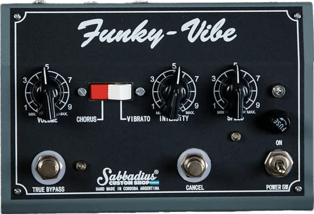 The Sabbadius 68 Funky-Vibe is an analog Uni-Vibe effects pedal engineered to authentically reproduce the modulating chorus and vibrato sounds of the original 1960s units. Built with rare NOS components, including Matsushita transistors and vintage bulbs, this Uni-Vibe pedal offers both chorus and vibrato modes selectable via a rocker switch. Users can opt for true bypass switching or select the "Cancel" function, which bypasses the effect circuit but retains the preamp coloration of the signal. The Funky-Vibe operates at the correct vintage voltage, maintaining an accurate response and tonal character.