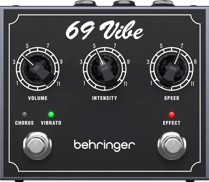 The Behringer 69 Vibe is a vintage '69-style modulation effects pedal designed to recreate classic chorus and vibrato sounds. This modulation pedal features footswitchable modes, allowing the user to toggle between chorus and vibrato effects in real time. The onboard speed control knob provides direct adjustment of the modulation rate, tailoring the effect to preference. Dual input jacks offer flexible connectivity options for various instrument setups. The pedal operates with true bypass switching, ensuring signal integrity when the effect is disengaged.