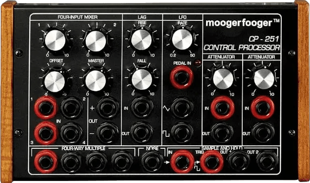 The Moog CP-251 Control Processor is a modular CV utility module designed for generating, modifying, and routing control voltages within an analog synthesizer or effects pedal setup. This device provides eight independent analog control-signal processing functions, suitable for integrating and expanding the capabilities of Moog effects pedals, voltage-controlled analog synthesizers, and other gear with CV input/output. Its all-analog signal path ensures compatibility with professional stage and studio environments.