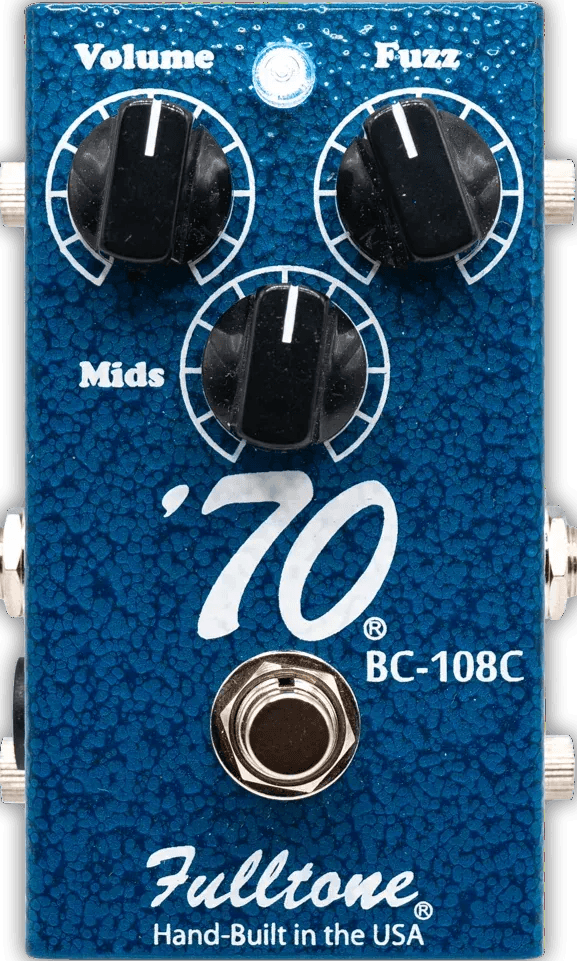 The Fulltone 70 Pedal-BC is a silicon fuzz stompbox designed to deliver classic 1970-style fuzz tones. This analog fuzz effects pedal uses two intentionally mismatched silicon transistors for increased harmonic complexity and distinctive, aggressive fuzz textures. The pedal features controls for Fuzz, Volume, and a dedicated Mid control, offering users the ability to tailor midrange clarity and presence. The 70 Pedal-BC employs true bypass switching for uncolored signal paths and is built with a durable 16-gauge steel enclosure with a powder-coated blue finish. This Fulltone effects pedal is compatible with bass instruments.