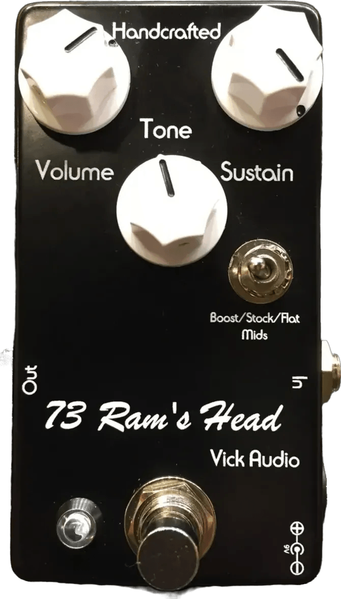 The Vick Audio 73 Ram’s Head is a fuzz effects pedal modeled after the classic 1973 Big Muff circuit, designed to deliver a balanced blend of smooth distortion and extended sustain. This analog fuzz stompbox features controls for sustain, tone, and volume, allowing users to dial in a wide range of fuzzy textures, from mellow sustain to more aggressive saturation. The unit incorporates true bypass switching to preserve signal clarity when the effect is disengaged.