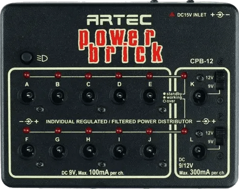 The Artec CPB-12 Power Brick is a regulated multi-output power supply designed for effects pedals. It features twelve isolated outputs, including ten 9V DC connections (each outputting up to 100mA) and two selectable outputs offering either 9V or 12V DC at up to 300mA per channel. Each output is individually hum filtered to support low-noise operation in pedalboard setups. The unit is equipped with four integrated LEDs for pedalboard illumination, and includes a dedicated AC to DC adaptor for power.