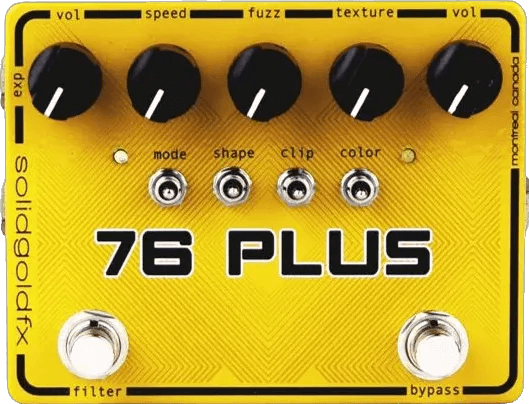 The SolidGoldFX 76 Plus is a combination octave up fuzz pedal and wah-style filter designed for a wide range of distortion and tonal shaping applications. This effects pedal delivers classic octave-up fuzz with a dedicated fuzz intensity control, and includes a fixed octave-up section. The filter section features a speed slider to adjust filter sweep rate, with additional Mode and Shape switches to tailor the character of the effect. The Texture control offers a variable midrange response, while Color and Clip switches provide control over treble and compression levels. An expression pedal input allows for real-time manipulation of the filter effect.