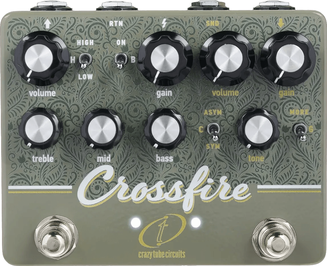 The Crazy Tube Circuits Crossfire is a dual overdrive effects pedal designed to deliver a wide range of classic and modified drive sounds. The left channel emulates the tonal characteristics of vintage blackface amplifiers, featuring selectable headroom to replicate either solid state or tube rectification for varying dynamic responses. The right channel is an analog overdrive circuit based on a late 1970s green mid-hump pedal, incorporating selectable symmetrical or asymmetrical clipping, an adjustable gain switch for expanded saturation and low-frequency shaping, and an internal high-headroom option using 18V operation.
