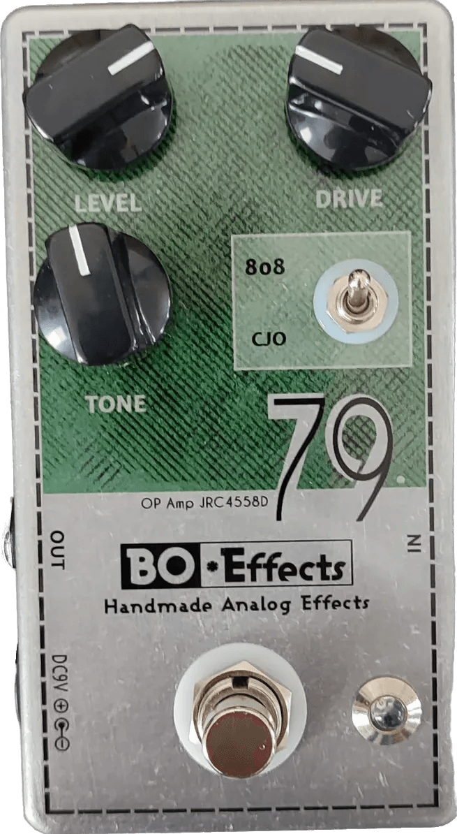 The BO EFFECTS 79 The Green Overdrive is an overdrive effects pedal designed to deliver two classic overdrive tones. In "808" mode, this pedal provides the sound characteristics of the well-known Tube Screamer TS808 overdrive, while the "HOT" mode offers overdrive voicing inspired by the Clay Jones Overdrive circuit. The pedal features a straightforward control layout for easy adjustment of drive, tone, and level, allowing for tailored overdrive response.