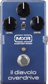 The MXR CSP036 Il Diavolo Overdrive is an overdrive effects pedal designed for flexible drive tones, using a "Hot Rodded" circuit developed with input from Carlo Sorasio. This pedal offers extended bass and midrange response and features two selectable gain modes for varying levels of overdrive, from organic boost and smooth overdrive to higher-gain distortion textures. The device is housed in MXR’s Custom Shop enclosure and provides standard connectivity for easy integration into pedalboards.