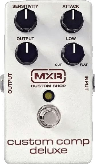 The MXR CSP204 Custom Comp Deluxe is an analog compressor effects pedal designed to provide enhanced dynamic range and transparency by utilizing the vintage CA3080 “metal can” IC. This MXR compressor pedal features dedicated controls for Sensitivity, Attack, Output, and Low, allowing for precise adjustment of compression parameters. RF suppression components are integrated to minimize interference, supporting quiet and reliable operation. Built with heavy-duty potentiometers and a robust footswitch, this compressor stompbox is configured for dependable use in live or studio environments.