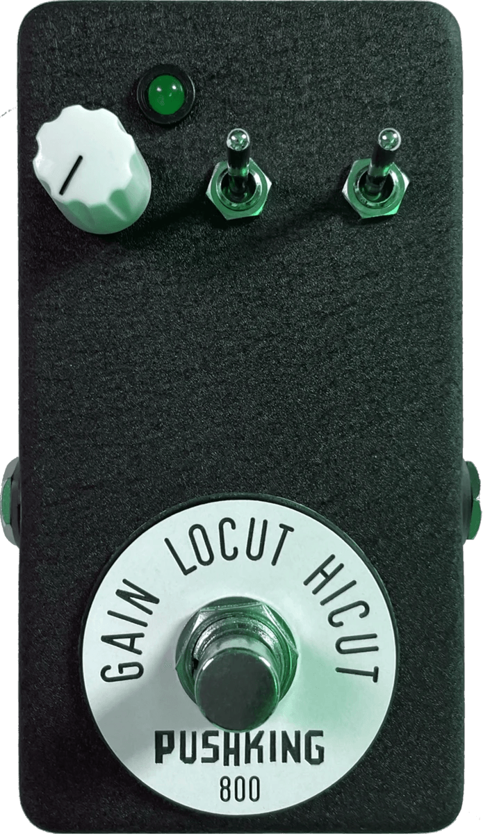 The Pushking Pedals 800 FULLBOOST is a boost effects pedal engineered to emulate the dynamics and harmonic response of an added tube stage. It features a gain control that offers unity gain at its lowest setting, with added headroom as you increase the level. Two mini toggle switches provide selectable low or high cut options, enabling tone shaping for focused sound applications. The pedal runs on a standard 9V power supply and internally converts voltage to 18V for increased headroom. True bypass switching, utilizing an optocoupler, is designed to minimize switching noise.