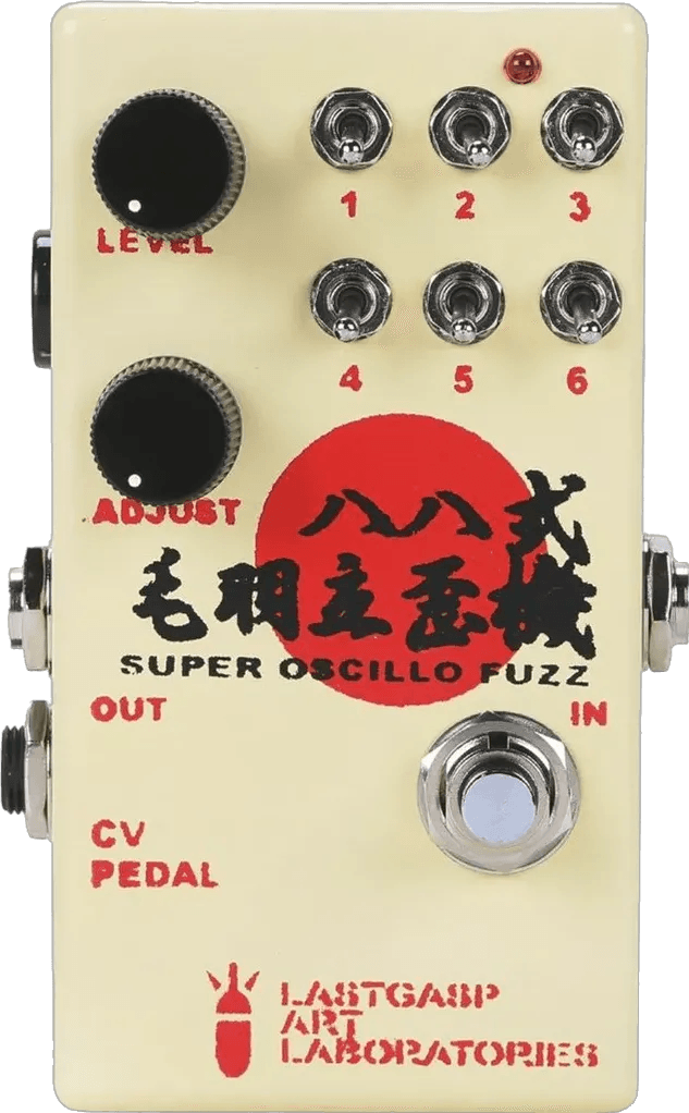 The Lastgasp Art Laboratories 88 – Super Oscillo Fuzz is a fuzz distortion effects pedal featuring an integrated internal oscillation system. This fuzz stompbox offers six toggle switches that allow selection between various fuzz distortion types and oscillation patterns. By combining these switches, users can access a wide range of fuzz tones, from standard distortion to complex, oscillating textures.