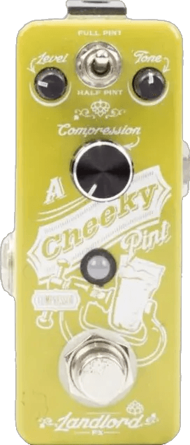 The Landlord Fx Cheeky Pint is a compressor effects pedal designed for dynamic control and tonal shaping in your signal chain. Featuring two selectable compression modes—Full Pint and Half Pint—the pedal offers both aggressive and responsive compression styles. Its three-knob layout allows adjustment of level (output volume), tone (EQ shaping), and compression (amount of compression), providing straightforward control over your sound without unnecessary complexity. The Cheeky Pint utilizes true bypass switching to ensure signal integrity when not engaged.