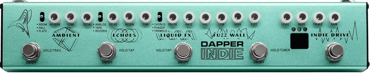 The Valeton Dapper Indie is a multi-effects pedal that integrates multiple effects types into a single compact unit, providing a range of modulation, delay, and reverb sounds suitable for ambient, indie, and experimental styles. This effects pedal combines several essential tools for creating layered soundscapes and unique tonal variations, with intuitive footswitches for real-time control and straightforward operation. The unit offers true bypass switching, core controls for each effect, and connections for standard pedalboard integration.