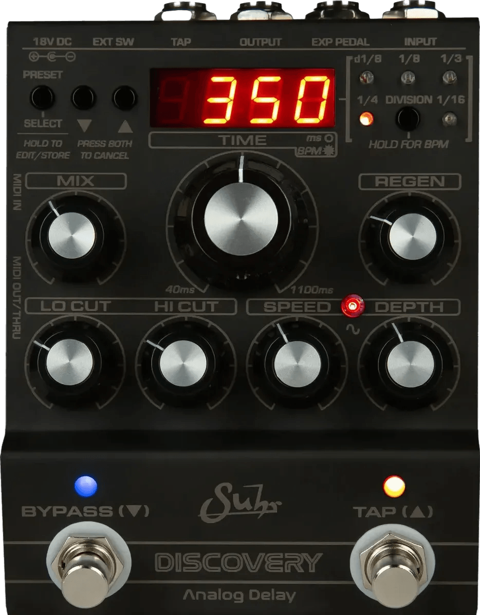 The Suhr Discovery Analog Delay pedal is an all-analog delay effects pedal designed to deliver classic bucket brigade echo with modern digital control options. Featuring an analog signal path using four reissue MN3005 chips, the delay range is adjustable from 40ms up to 1100ms, and can be extended to 17ms–2000ms via tap tempo and subdivision controls. The onboard modulation section offers three waveform choices for shaping the delay repeats, while a two-knob EQ section allows further tonal adjustment. The pedal supports saving and recalling up to 127 presets, and provides full MIDI functionality for advanced control. Connectivity includes an expression pedal input for assigning to various parameters, as well as selectable true bypass or buffered bypass, and a dedicated kill dry mode for parallel signal routing.