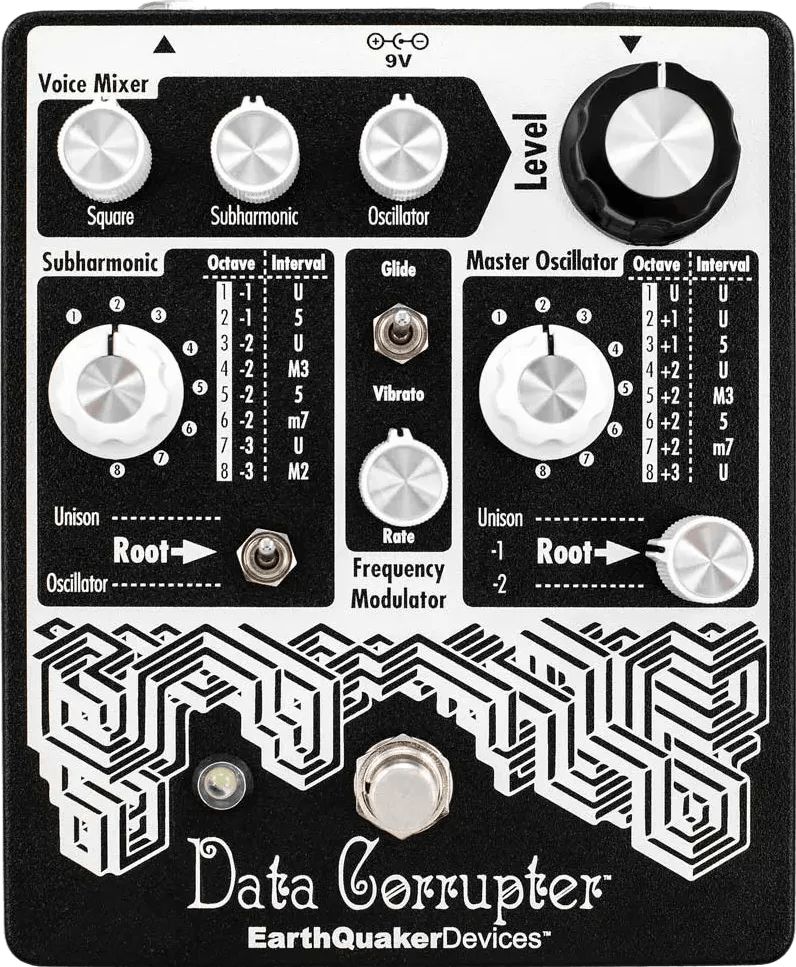 The EarthQuaker Devices Data Corrupter is an analog monophonic harmonizing PLL (phase-locked loop) pedal designed to transform your input signal into a modulated, harmonically rich square wave fuzz effect. It generates three customizable voices, providing master oscillator and subharmonic channels with multiple octave settings. The pedal multiplies, divides, and modulates the signal, enabling a wide range of synth-inspired tones, both above and below the original pitch. Key controls include a Subharmonic Root switch for independent oscillator selection and a Frequency Modulator for further sound shaping. Each parameter is optimized for real-time performance, with touch-responsive analog synth effects and fuzz textures.