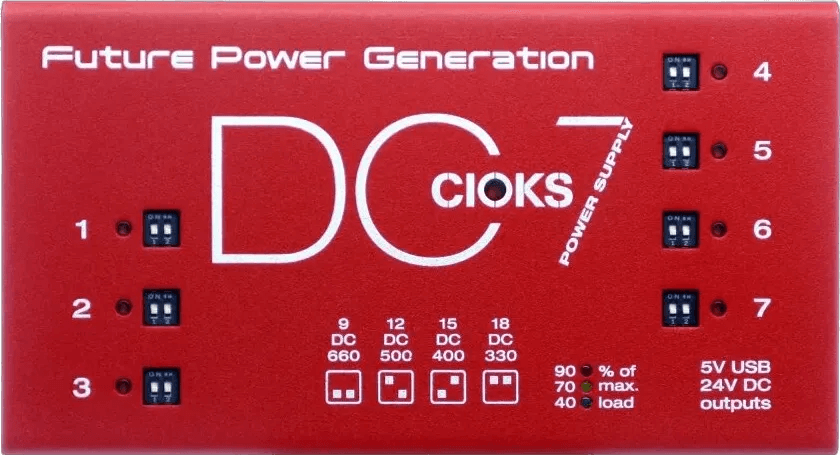 The CIOKS DC7 is a multi-output pedalboard power supply designed to provide reliable, isolated DC power for effects pedals. Featuring a slim one-inch profile and a weight of 1.1 pounds, this CIOKS pedalboard power supply offers seven isolated DC outputs, each with four selectable voltages. Each output can deliver up to 660mA (6W) at 9V, suitable for powering high-current effects pedals. The CIOKS DC7 also includes an onboard 5V USB outlet and a 24V auxiliary output, ensuring support for a range of music gear. This pedal power supply is expandable with CIOKS 4, CIOKS 8, or the Crux for additional isolated outputs. Multiple cable configurations support various pedalboards.