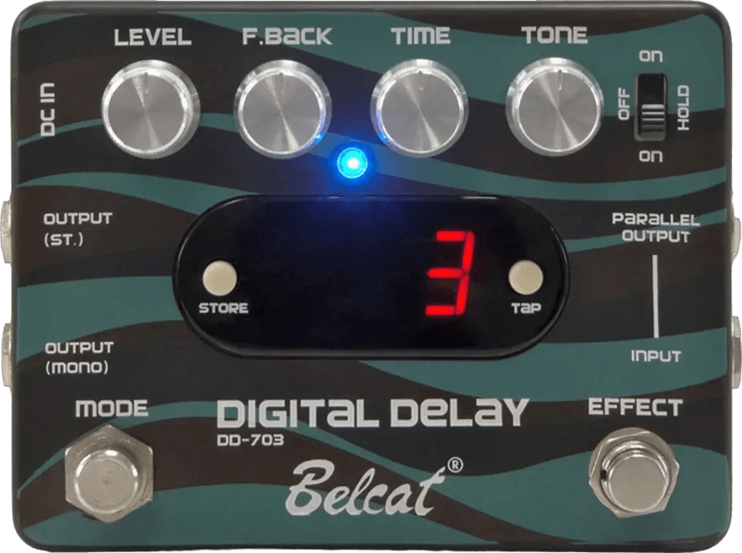 The Belcat DD-703 is a digital delay pedal designed for flexible delay effects and user-controlled programmability. This unit provides stereo output and supports up to 10 programmable presets, allowing quick recall of saved delay settings. With the integrated tap tempo function, users can set delay times on the fly, while a parallel output enables flexible routing options. Additional functions include a hold mode for repeating loops and a clear LCD screen for easy visual reference during operation.