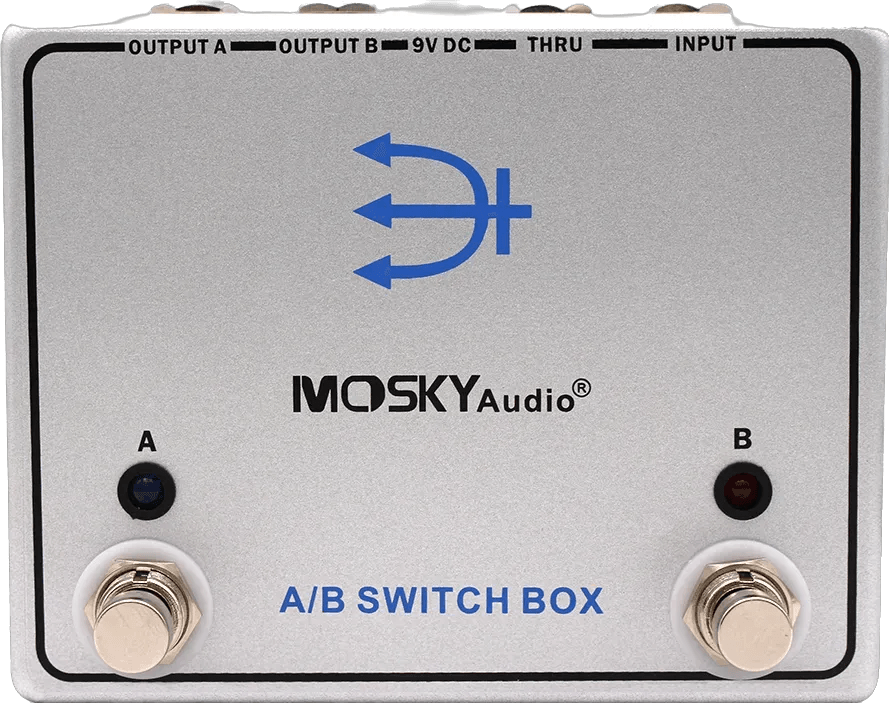 The Mosky A/B Switch Box is a signal routing utility pedal designed for switching between two output paths or combining them for simultaneous use. This A/B switch pedal enables flexible signal management, allowing musicians to route their instrument's output to either of two outputs or both. The Thru jack provides a continuous signal output for connecting to tuners, amplifiers, or other audio devices. Built with a robust die-cast enclosure, the Mosky A/B Switch Box features high-quality jacks and durable footswitches for reliable operation.