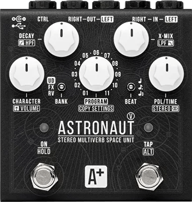 The Shift Line A+ Astronaut V is a multi-algorithm space reverb effects pedal featuring 22 unique sound-processing algorithms and 33 user-adjustable presets. Utilizing an ARM® processor, Cortex® technology, and an Analog Devices codec, this reverb stompbox delivers a wide range of ambient textures from classic reverbs to advanced soundscapes and arpeggiated effects. User settings for each algorithm can be saved directly to the pedal’s onboard memory via the updated interface, allowing for instant preset recall and live flexibility.