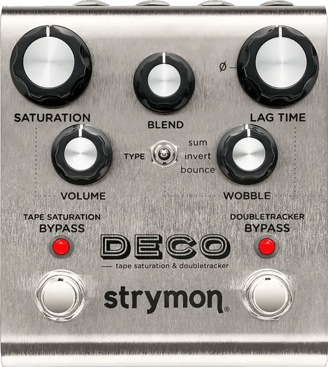 The Strymon Deco V1 is a stereo tape saturation and doubletracking effects pedal designed to deliver classic reel-to-reel tape sounds. This Strymon effects pedal offers tape saturation, providing smooth compression and vintage tape overdrive. The doubletracker section delivers adjustable tape flanging, slapback echo, and chorus effects, enabling a variety of classic modulation and time-based sounds. The Deco V1 supports stereo operation for wide signal routing and features true bypass switching for signal integrity.