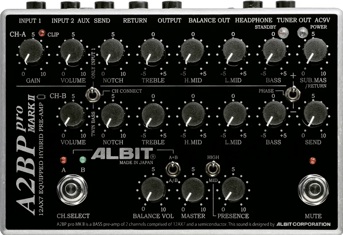 The ALBIT A2BP pro MARK II is a 2-channel bass preamp pedal engineered for flexible tone shaping and expanded connectivity. This updated version drives vacuum tubes at high voltage, delivering tube-driven preamplification, with each channel featuring a distinct EQ configuration: Channel A retains the original tone circuit, while Channel B uses the advanced tone circuit from the A1BP pro MARK II. Both channels provide a flat frequency response with tone controls set to center. The traditional mute switch is now a footswitch, enabling hands-free operation. The BALANCE VOL control allows separate level adjustment for the balanced (BALANCE OUT) output, independent of the MASTER volume. An AUX IN input has been upgraded to a 3.5mm jack for broader device compatibility.