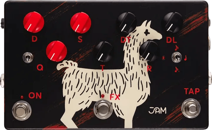 The Jam Pedals Delay Llama Supreme is an analog delay pedal designed to deliver warm, organic repeats using BBD chips accurately modeled after the Panasonic MN3205. This delay effects pedal features tap tempo, multiple rhythm subdivisions, and a hold function for enhanced delay manipulation. Dedicated expression pedal inputs allow control over both delay time and delay level. The on-board tone control adjusts the character of repeats from dark to bright, while the internal trimmer sets the maximum number of repeats. Modulation options include a built-in WaterFall chorus with adjustable depth and speed, as well as a Q filter with independent range and depth controls. The Delay Llama Supreme offers up to 600ms of delay time and is compatible with bass instruments.