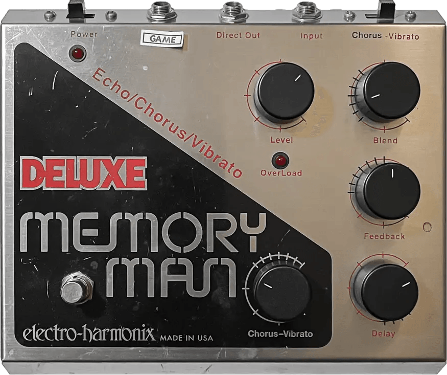 The Electro-Harmonix Deluxe Memory Man (90s big box version) is an analog delay pedal utilizing a bucket brigade device (BBD) circuit to deliver classic, warm delay and modulation effects. Introduced in 1996, this large-format effects pedal offers delay, chorus, and vibrato controls, and features an all-analog signal path. The Deluxe Memory Man (big box) is recognized for its distinctive enclosure and collectible status among Electro-Harmonix effects pedals from the 1990s era.
