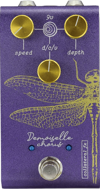The Collateral FX Demoiselle Chorus is an analog chorus effects pedal designed to deliver a wide range of classic and modern modulation sounds. This chorus stompbox offers both subtle and high-speed modulation, inspired by vintage chorus circuits, with added flexibility through an integrated vibrato mode. The unique D/C/V (Dry/Chorus/Vibrato) blend control allows adjustment of the balance between dry signal, chorus effect, and vibrato, enabling precise tonal shaping. The pedal operates in mono and offers a warm, analog character suitable for diverse musical applications.
