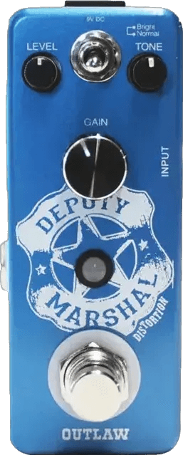 The Outlaw Effects Deputy Marshal Plexi Distortion pedal delivers a classic British amp distortion sound in a compact effects pedal format. Designed to emulate the character of Plexi-era tube amps, this distortion stompbox features Gain, Tone, and Volume controls for detailed tone shaping. A Bright/Normal toggle switch provides two voicing options, allowing users to enhance high-frequency response. The pedal operates with true bypass switching, ensuring signal integrity when not in use.
