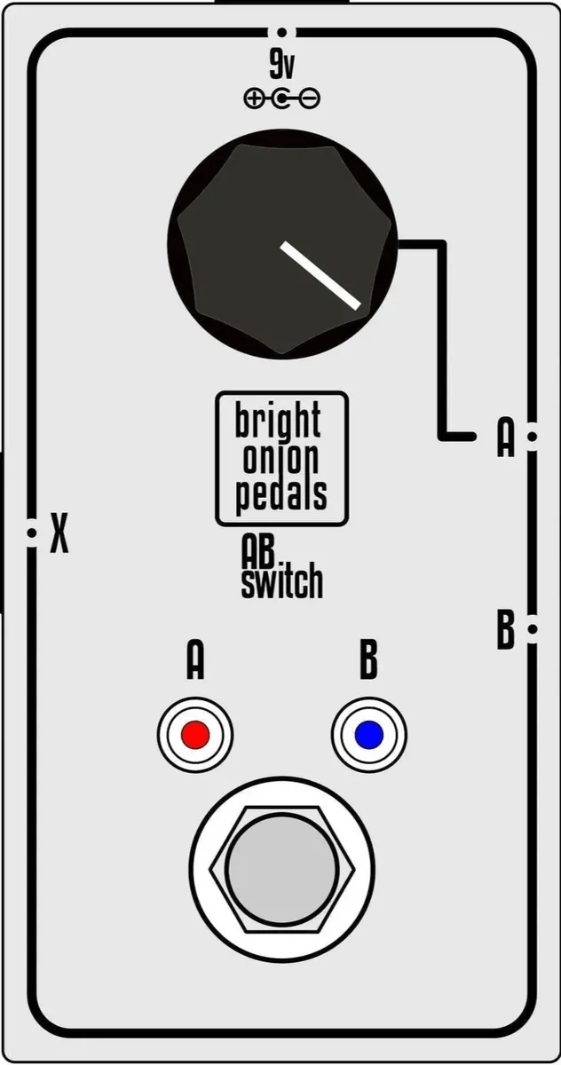 The Bright Onion Pedals AB Switch with Volume Control is a passive AB switch pedal that routes either Input A or Input B to a single output. Input A features an adjustable volume potentiometer, allowing precise signal balancing when switching between sources with varying output levels. The status LEDs are powered via a standard 2.1mm center-negative 9V DC socket. The unit includes a heavy-duty 3PDT footswitch and robust Neutrik connectors, all housed in a durable aluminum enclosure. Operation does not require power unless the LEDs are used.