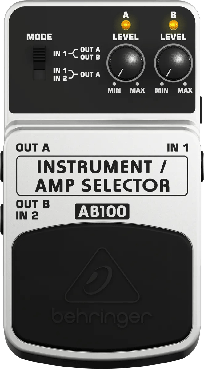 The Behringer AB100 Instrument/Amp Selector is an A/B switch pedal designed for seamless channel or instrument switching. This pedal allows users to route a single signal to two different outputs, or alternate between two input sources into one amplifier or effects chain. Featuring clearly labeled footswitches and LED indicators, the AB100 offers straightforward switching for live performances or studio setups.