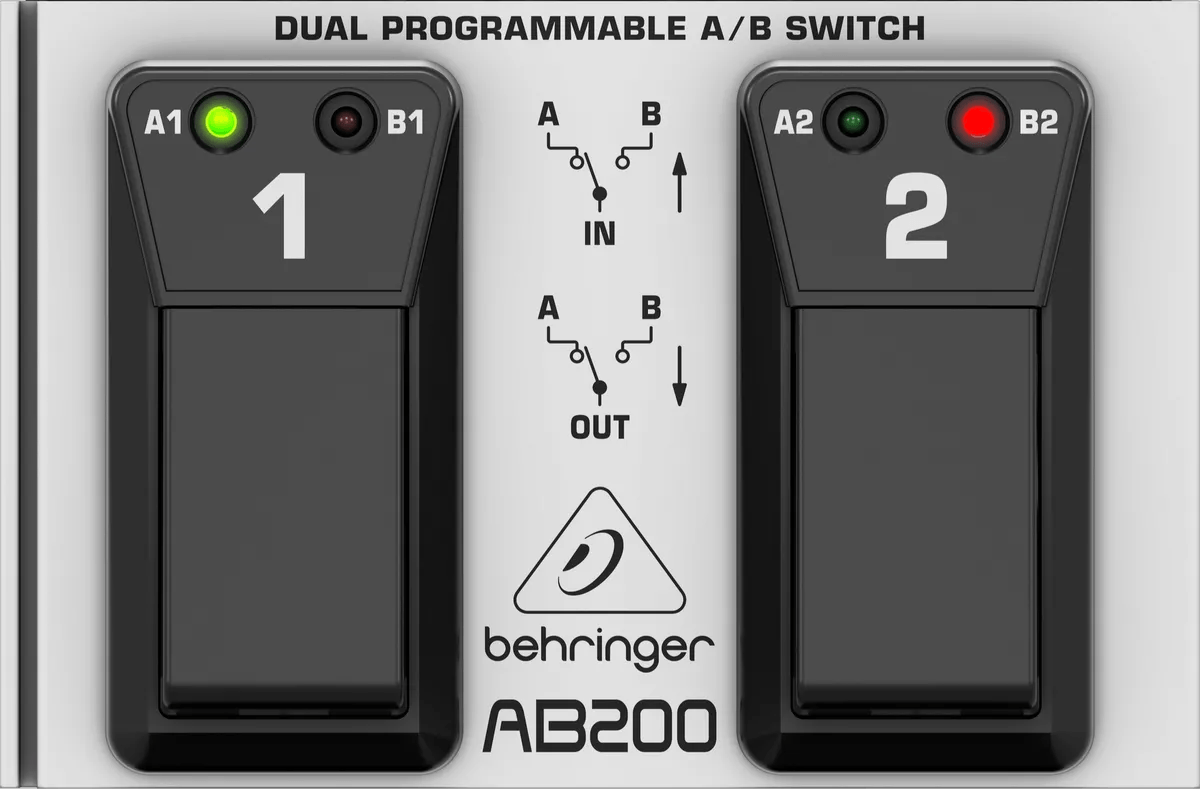 The Behringer AB200 is a compact, universal 2-channel foot switch designed for routing and switching audio or control signals in studio and live setups. This foot switch offers both latching and non-latching operation for each channel, supporting a range of external control applications. The AB200 can either combine two input signals into a single output, or split one input signal to two outputs, making it suitable for routing instruments, effects, or other compatible devices. Connectivity is provided through standard 1/4" jacks, enabling integration with amplifiers, effects pedals, keyboards, rhythm machines, and lighting equipment that accept external switch control.