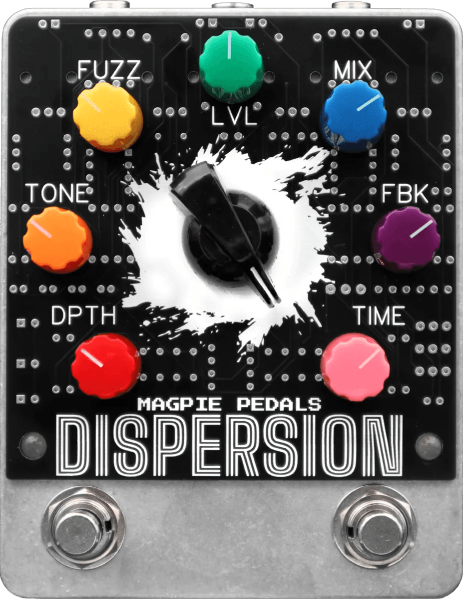 The Magpie Pedals Dispersion is a multi-function effects pedal combining pitch-controlled square wave modulation, analog tremolo, and fuzz. The pedal generates square wave LFO-based modulation, which can be adjusted using external pitch input for synchronized parameter shifts. In addition to wide-range tremolo effects, Dispersion incorporates a fuzz circuit for added harmonic texture.