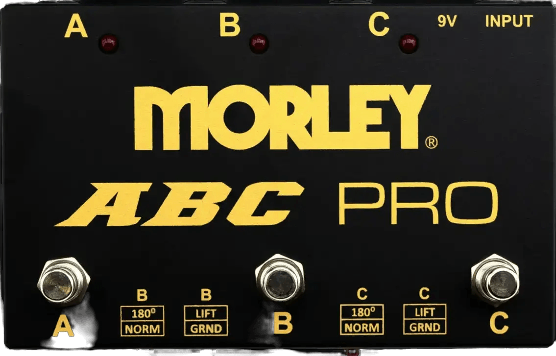 The Morley ABC Pro Selector is an audio routing switcher pedal designed to manage signals between multiple amplifiers or audio sources. This Morley switcher pedal enables the user to route one input to any combination of three outputs (A, B, or C), with individual footswitches for each channel. It features a custom Ebtech transformer for signal integrity, silent switching technology to minimize noise, and includes both a ground lift switch and a reverse polarity switch to address grounding and phase issues commonly encountered with multiple amplifier setups. The elevated enclosure improves accessibility during use.