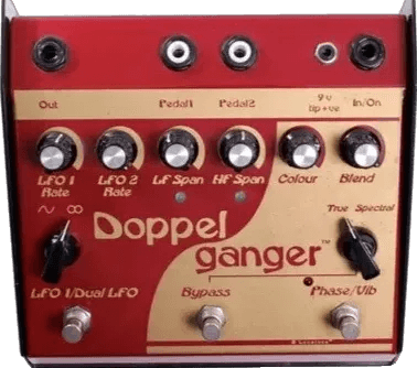 The Lovetone Doppelganger is an analog phaser and vibrato effects pedal, designed and manufactured in England during the mid to late 1990s. This Lovetone effects pedal utilizes dual oscillators to generate a range of modulated phasing and vibrato sounds. Controls for rate, depth, and blend enable detailed shaping of the modulation effect. The Doppelganger pedal also offers flexible routing and connectivity options for integration into pedalboards or studio setups.