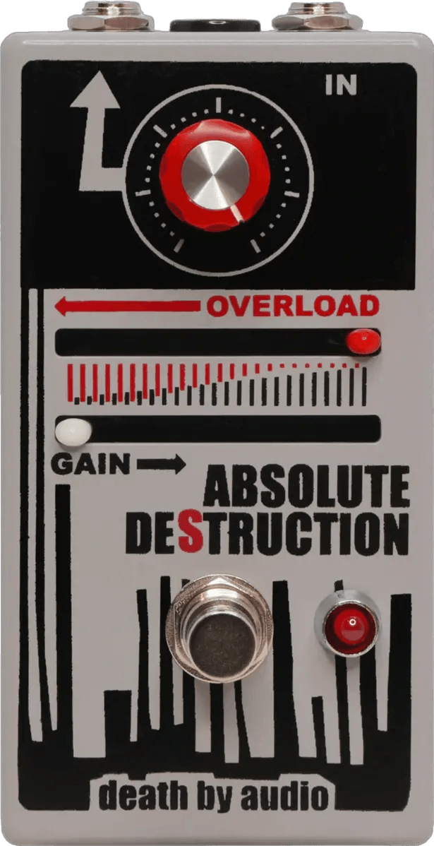 The Death By Audio Absolute Destruction is a fuzz effects pedal designed to deliver a range of extreme to unconventional distortion sounds, utilizing a power amplifier integrated circuit for signal processing. This fuzz stompbox features interactive Gain and Overload sliders, which can be adjusted independently to produce a versatile spectrum of tones—from aggressive octave fuzz to heavily compressed, chaotic textures. Manipulating the Overload slider to the left increases the intensity and speed of the destructive effect, while varying the Gain allows for customized attack and release behavior. The Absolute Destruction is true bypass for signal integrity and can be used in various studio or live setups.
